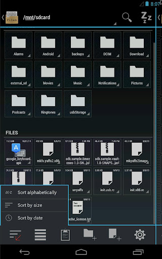 Le premier est le développement d'une librarie native (en c) pour interroger le système de façon optimale et homogène, aussi bien sur les zones de stockage classiques (comme la carte SD) que sur les partitions accessibles aux super-utilisateurs seulement. Cette librairie a été étendue pour parcourir les archives (archives imbriquées incluses) comme de simples dossiers.