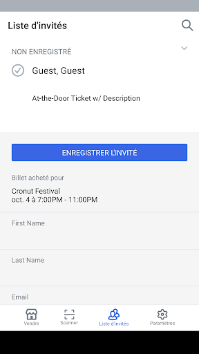 Enregistrez les invités en scannant les codes à barres/codes QR de leurs billets, ou recherchez vos acheteurs par nom.