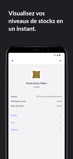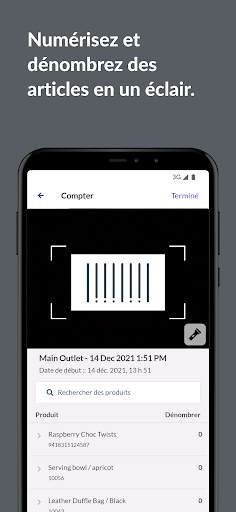 • Numérisez les étiquettes de code à barres ou les CUP de vos produits en stock grâce à l’appareil photo intégré.