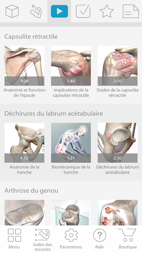 • 5 animations gratuites : la sciatique, la fasciite plantaire, la biomécanique du genou, l'anatomie de la hanche et la capsulite rétractile.
