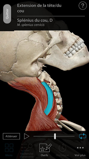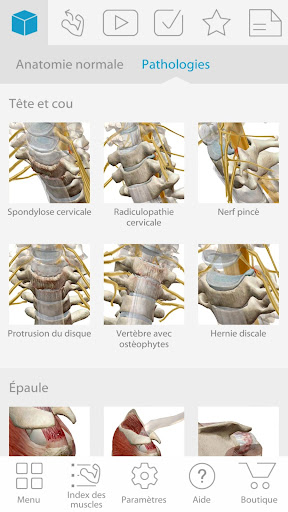 Muscle Premium est une référence exhaustive en 3D concernant les structures et les fonctions musculo-squelettiques. L'appli aborde également les lésions et pathologies courantes. Interagissez avec des modèles en 3D des os, ligaments, bourses séreuses et muscles squelettiques dotés des nerfs et de leur système vasculaire. Apprenez-en davantage sur l'alimentation sanguine, l'innervation, les origines et les insertions, et les surfaces des sites de fixation. Effectuez des rotations, des zooms arrière et des zooms avant sur les animations en 3D des actions musculaires courantes. Visualisez et comprenez les différences entre l'anatomie normale et les lésions et pathologies courantes grâce à notre section Pathologies.