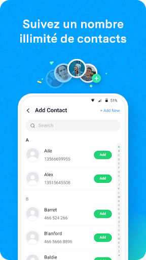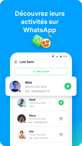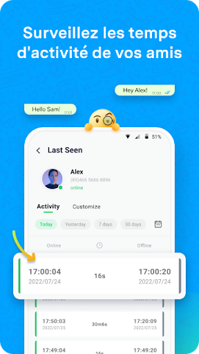 'Il n'est pas facile de surveiller le statut en ligne de mon enfant. J'ai utilisé ce tracker Whatsapp pour surveiller mon statut WhatsApp avec mon fils. J'ai constaté qu'il parle encore à ses amis la nuit, alors qu'il devrait dormir. Je peux voir l'historique de ses notifications en ligne ou recevoir des notifications en temps réel avec ce tracker WhatsApp, et enfin corriger ses mauvaises habitudes.' ---Emily