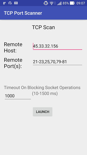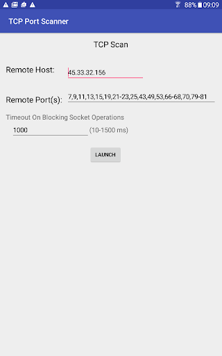 You have to specify remote host as an IPv4 address, ports and port ranges as arguments (that are separated by comma), and the timeout on blocking socket operations.