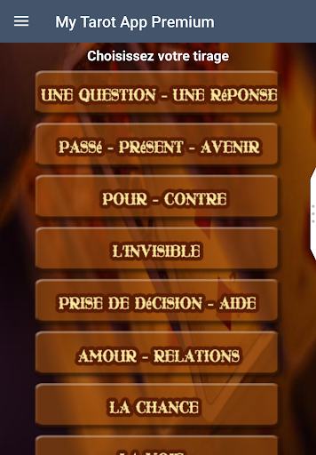 Avec l’application Mon Tarot Premium, vous pouvez choisir différents tirages de tarot divinatoire et bien plus.