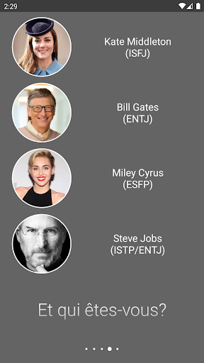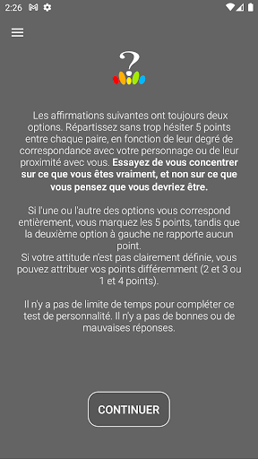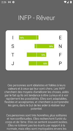 Ce test gratuit, indicateur de 16 personnalités, est un questionnaire introspectif d'auto-évaluation dont le but est d'indiquer les différentes préférences psychologiques dans la façon dont les gens perçoivent le monde qui les entoure et prennent des décisions.