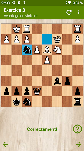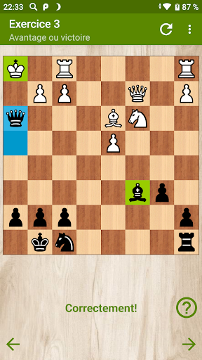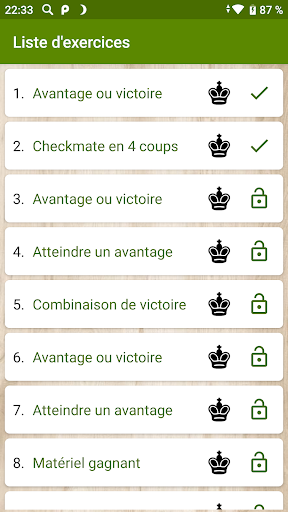 La version gratuite contient 18 puzzles intéressants avec des combinaisons de victoire, obtenant un avantage et matant en plusieurs coups. Après avoir résolu chacun d'eux, l'opportunité s'ouvre de regarder l'ensemble du jeu d'échecs, à partir duquel la position de l'exercice a été obtenue.