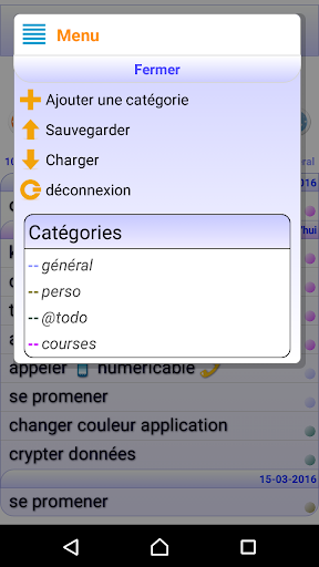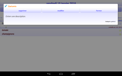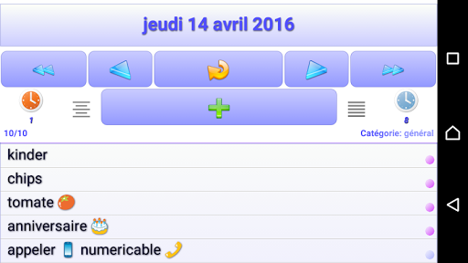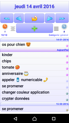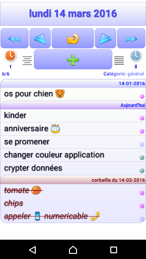 Créez une note dans le temps, entrez une description, placez la dans la corbeille du jour, videz la corbeille en cliquant sur son intitulé. Modifiez les notes ou descriptions, laissez vous guider par les alertes quotidiennes, créez des catégories (courses, pro...). Vous pouvez trier une journée en cliquant sur son intitulé, ajouter des taches plus rapidement grâce au bouton 1.Vous pouvez sauvegarder toutes vos données sur un serveur, ceci vous permet de synchroniser plusieurs terminaux entre eux. Désormais l'application vous notifie des taches de la journée, Attention vous êtes notifiés des tâches enregistrées sur le serveur et non sur l'application, ainsi il est nécessaire d'être connecté et de sauvegarder vos données sur le serveur.