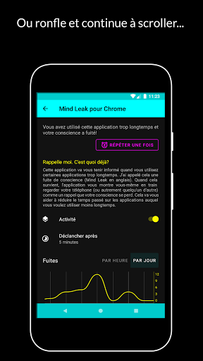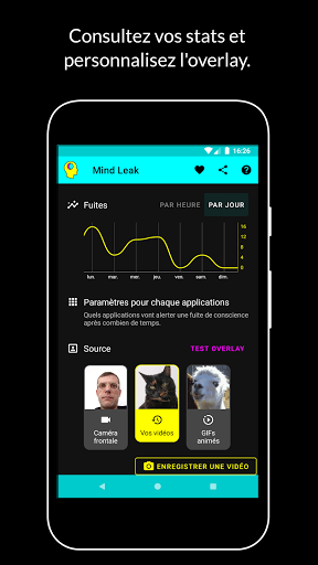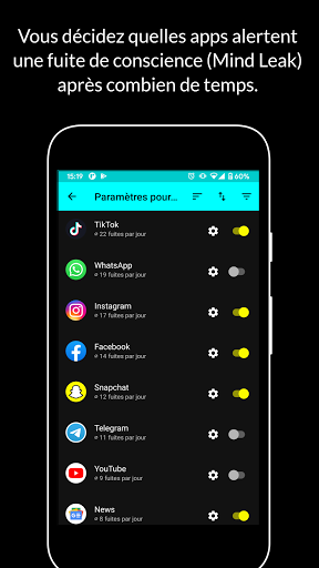Cette application va vous tenir informé quand vous utilisez certaines applications trop longtemps. J'ai appelé cela une fuite de conscience (Mind Leak en anglais). Quand cela survient, l'application vous montre vous-même en train regarder votre téléphone (ou autrement quelqu'un d'autre qui regarde) comme un rappel que votre conscience se perd. Cela va vous aider à réduire le temps passé sur les applications auquel vous voulez utiliser moins.