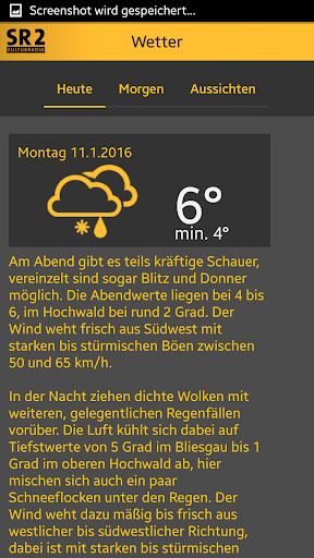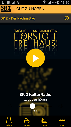 Mit der SR 2 App können Sie überall das SR 2-Programm hören und uns auch eine Nachricht direkt ins Studio schicken. Starten Sie mit dem Radiowecker in den Morgen und bleiben Sie auf dem Laufenden mit Nachrichten, Wetter, Verkehrsinfos und Veranstaltungstipps aus der Region.