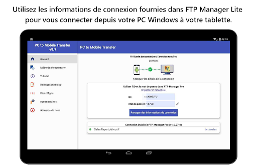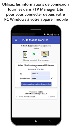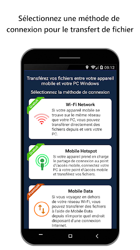 PC to Mobile Transfer vous permet de transférer des fichiers entre votre appareil Android et un PC Windows via Wi-Fi, point d'accès mobile ou réseau mobile.