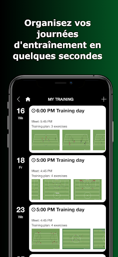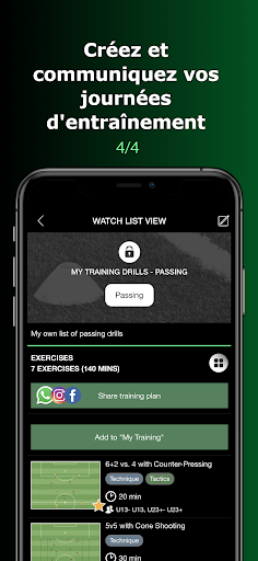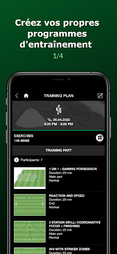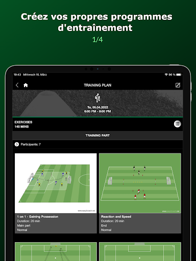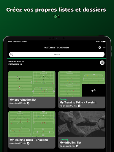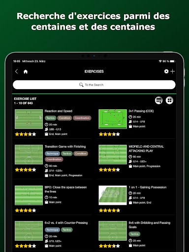 - Des centaines d'exercices de football catégorisés (techniques de balle, tactique, physique, formes de jeu et bien d'autres).