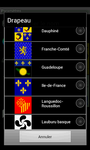 Les régions disponibles sont : Alsace, Anjou, Aquitaine, Auvergne, Béarn, Berry, Bourgogne, Bretagne, Catalogne, Centre, Champagne-Ardenne, Corse, Croix camarguaise, Dauphiné, Franche-Comté, Guadeloupe, Ile-de-France, la Réunion, Languedoc-Roussillon, Limousin, Lorraine, Martinique, Mayotte, Midi-Pyrénées, Nord-Pas-de-Calais, Normandie, Nouvelle-Calédonie, Pays Basque, Pays-de-la-Loire, Picardie, Poitou-Charentes, Polynésie française, Provence-Alpes-Côte d'Azur, Rhône-Alpes, Saint-Barthélémy, Saint-Martin, Saint-Pierre-et-Miquelon, Savoie, Terres australes et antarctiques, Touraine, Wallis et Futuna;