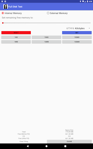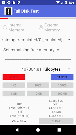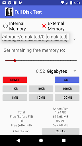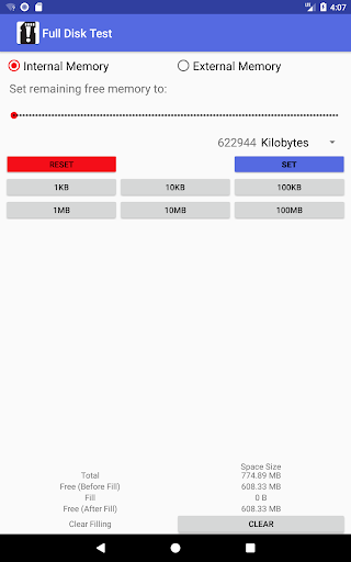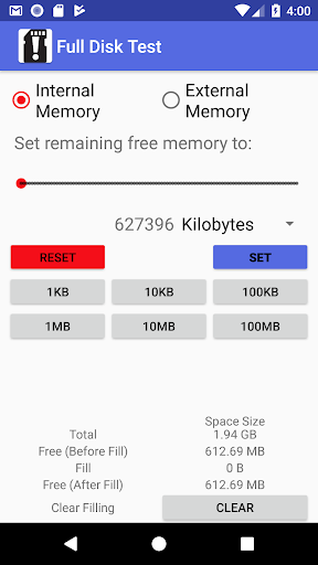 Reduces the amount of free internal and/or external memory to specified amount. Allows for quick and easy testing of applications in environment where free space is running out. Free space can be set with 1KB resolution. The special algorithm for filling space assures the best possible speed of operations.
