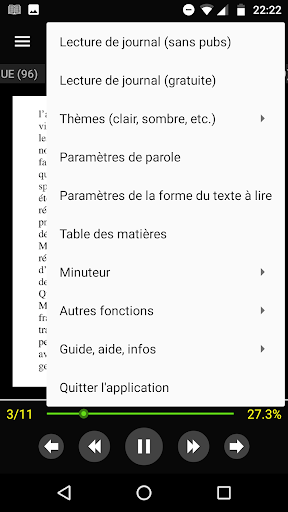 Les utilisateurs peuvent arrêter la lecture, passer à la page suivante ou revenir à la page précédente, modifier le réglage de la parole (la vitesse de lecture et l'hauteur de la voix), régler la minuterie pour lire ou arrêter la lecture automatiquement.