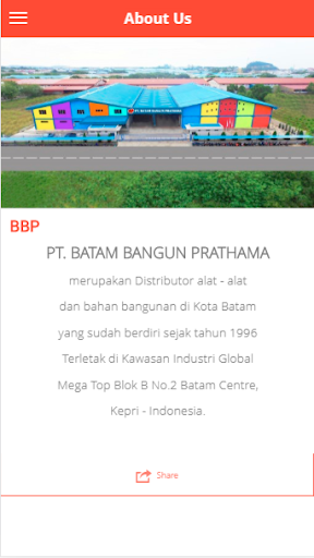 PT. BATAM BANGUN PRATHAMA merupakan Distributor alat - alat dan bahan bangunan di Kota Batam yang sudah berdiri sejak tahun 1996 Terletak di Kawasan Industri Global Mega Top Blok B No.2 Batam Centre, Kepri - Indonesia.