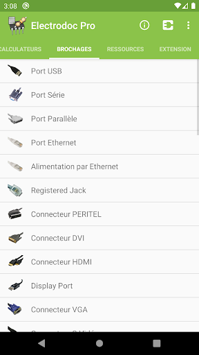 • brochages (Port USB, Port Série, Port Parallèle, Port Ethernet, Alimentation par Ethernet, Registered Jack, Connecteur PERITEL, Connecteur DVI, Connecteur HDMI, Display Port, Connecteur VGA, Connecteur S-Vidéo, Connecteur VESA, Connecteur Jack, Connecteur FireWire, Connecteur RCA, Connecteur DIN audio, XLR et DMX, Connecteur d'alimentation ATX, Connecteurs PC Molex, EIDE/ATA - SATA, Connecteur PS/2-AT, Code couleur câble 25 paires, Couleur câbles fibre optique, Connecteur MIDI, MIDI/Port Jeux, Connecteur Apple 30-pin, Connecteur Apple Lightning, PDMI, Connecteur voiture OBD-II, Connecteurs ISO pour autoradios, Connecteur de remorques, Brochage SD Card, Cartes SIM/Smart, Brochage Raspberry Pi, Brochage LCD, Brochage GPIB/IEEE-488, Code couleur des thermocouples, Cartes Arduino, Brochage JTAG, Cartes BeagleBone);