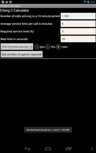 This application uses Erlang C formula[1] employed in call center applications to estimate the number of agents required to handle a projected call load at a prescribed service level. The inputs required are 1) number of calls arriving in a 15 minute period, 2) average service time in minutes for the calls during that period, 3) percent service level (i.e. percent of incoming calls that need to be answered within a given wait time) and 4) wait time in seconds. The calculator not only calculates the number of agents required to meet the service level target but also provides a detailed table illustrating the service level degradation that would be experienced if the call center employs less than the suggested value by Erlang C formula. A graphical view of the tabular data is also provided.