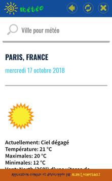 Application météo donnant en temps réel une brève météo selon votre localisation géographique. Exemple ci-après pour Paris le 17/10/2018 à 15h00: