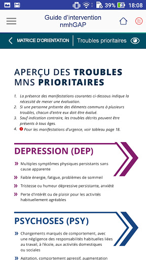 L’application mhGAP-IG 2.0 (e-mhGAP) est la version électronique 2.0 officielle du guide d’intervention mhGAP de l’Organisation mondiale de la Santé pour lutter contre les troubles mentaux, neurologiques et liés à l’utilisation de substances psychoactives dans les structures de soins non spécialisées. L’application mhGAP-IG 2.0 est un outil précieux pour améliorer les services proposés aux personnes atteintes de troubles MNS et à leur famille.