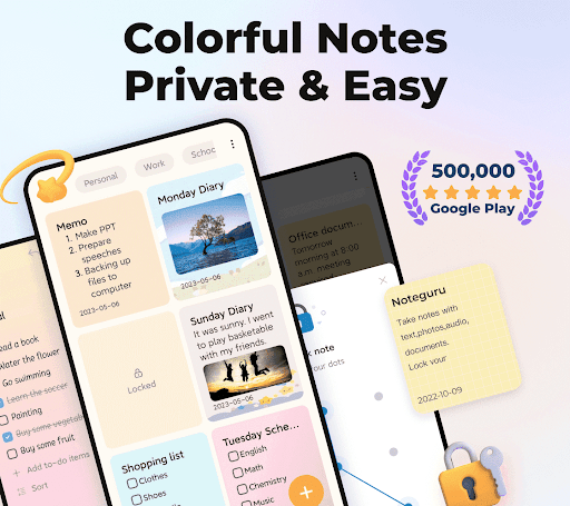 Note Guru helps you to keep notes and memos private with locks. Note writer Locker protects a single note or the whole note pad to keep your notes and notebooks safe.