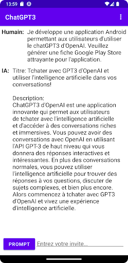 Humain : je développe une application Android permettant aux utilisateurs d'utiliser le chatGPT3 d'OpenAI. Veuillez générer une fiche Google Play Store attrayante pour l'application.