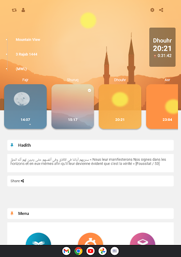 les horaires de la prière(Adhan), ce programme à été conçue pour vous notifié chaque heure de prière en fonction de votre emplacement et vous pouvez voir les heures des cinq prières quotidiennes.