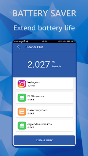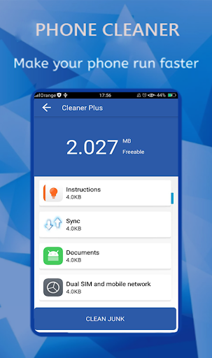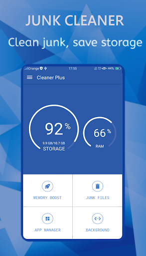 Phone Cleaner Pro est un nettoyeur intelligent pour téléphones mobiles Android, Booster, économiseur de batterie et nettoyeur de mémoire. Ce nettoyeur d'android de haute technologie permet de renforcer vos téléphones mobiles en arrêtant des applications et des processus d'arrière-plan intensives de ressources afin d'éviter la surchauffe et la décharge de la batterie. Il vous aide également à supprimer de grands fichiers indésirables pour libérer de l'espace (nettoyeur de stockage). Il contient plusieurs fonctionnalités d'autres pour améliorer les performances mobiles, telles que: Cache Nettoyant qui fournit plus de stockage; Nettoyant RAM en libérant des béliers occupés; économiseur de batterie pour économiser la vie de la batterie; Téléphoner refroidisseur (CPU Cooler) Pour refroidir le téléphone.