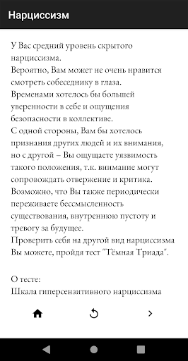 В качестве обратной связи по каждому из тестов предусмотрен небольшой комментарий, основанный на реальном психологическом смысле, заложенном в каждом из тестов.