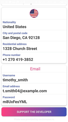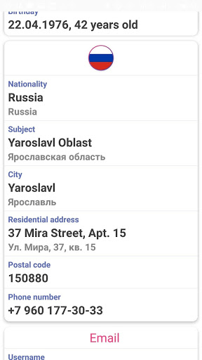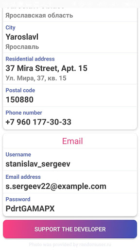 Le format de l'adresse et du nom correspond également au pays choisi. En Russie, des informations sont générées en Cyrillic et en latin.
