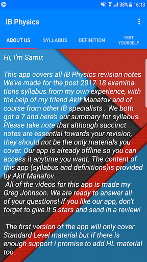 Très facile à utiliser, application gratuite et d'éducation qui couvre l'ensemble du programme physique.Pour 2017 avec beaucoup de tests, des informations hors ligne et des vidéos.C'est pour les personnes qui souhaitent rafraîchir leurs souvenirs et ramener des informations qu'ils ont manqués en classe.C'est cool lorsque vous pouvez obtenir la majeure partie du contenu de la physique IB avec un clic