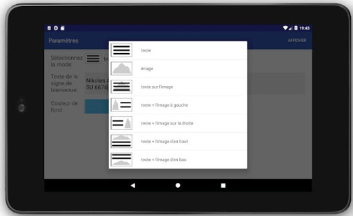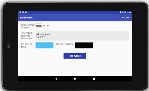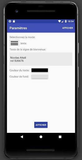 Cette application transforme votre tablet ou telephone en signe de bienvenue/ banner/ board avec le grand texte ou l’image. Il ne faut pas besoin écrire ou dessiner un signe de bienvenue en papier, utilisez simplement notre application. L’application permet de changer la taille, la couleur du texte, de changer les images. L'application peut-être utilisée par des représentants d'hôtel ou d'entreprise, des chauffeurs de taxi dans les aéroports ou les gares.