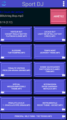 En appuyant sur le bouton d'arrêt disparaît le volume du morceau progressivement et automatiquement Queues une nouvelle chanson au hasard à jouer. De nombreuses fonctions de chansons au hasard dans d'autres applications jouent les mêmes morceaux plusieurs fois mais Sport DJ ne joueront pas la même chanson dans les 2 heures à moins que tous les autres chansons ont été jouées au moins une fois.
