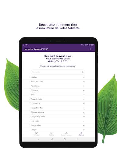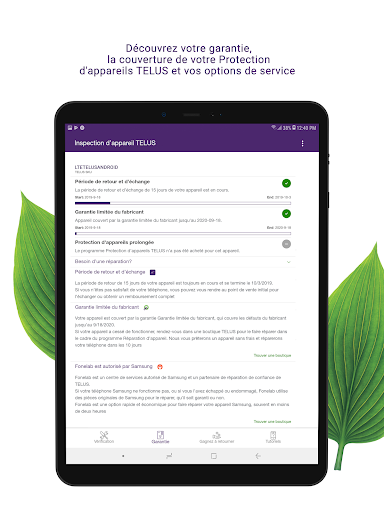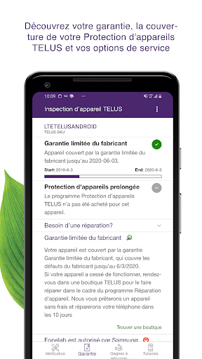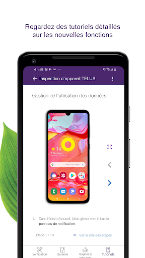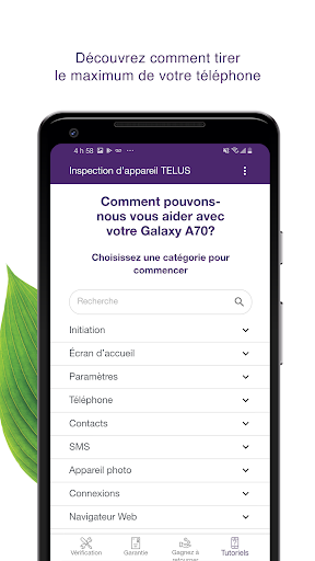 Le programme Inspection d’appareil TELUS(MC) comporte quatre outils pour vous aider à tirer le maximum de votre téléphone à TELUS. L’outil d’inspection vous offre des conseils et des recommandations et vous aide à configurer les principales fonctions du réseau de TELUS. L’outil de garantie vous présente les options de réclamation ou de réparation au titre de votre garantie et de la Protection d’appareils TELUS. L’outil de reprise vous fait passer une série de tests interactifs pour estimer votre valeur de reprise. L’outil de tutoriel est un centre de formation à domicile, qui vous aide à tirer le maximum de votre téléphone TELUS et des fonctions Android.