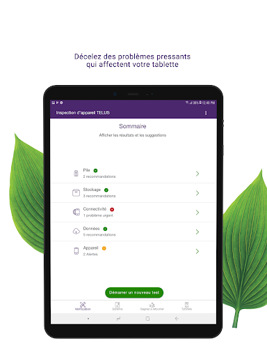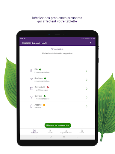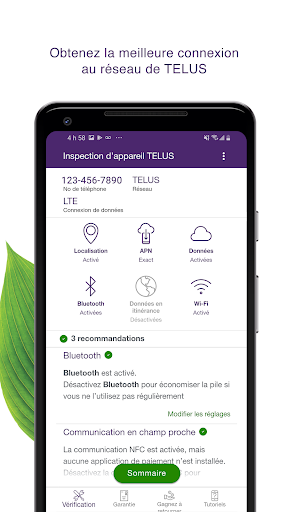 L’application Inspection d’appareil TELUS demande un certain nombre de permissions qui permettent de mieux diagnostiquer et comprendre votre appareil. Cette information est utilisée pour vous proposer des suggestions d’amélioration de votre appareil et pour nous aider à améliorer l’application. La confidentialité de vos renseignements personnels est assurée. Pour en savoir plus sur la protection de la vie privée à TELUS, vous pouvez cliquer sur la politique ci-dessous ou visiter telus.com/privee