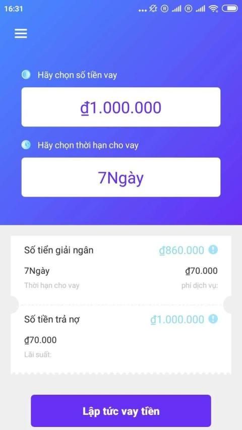 Ví dụ: Nếu bạn chọn giới hạn cho vay là 1.000.000 đồng trong vòng 100 ngày, tiền lãi phải trả là: 1.000.000 * 24% = 240.000 đồng