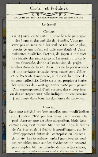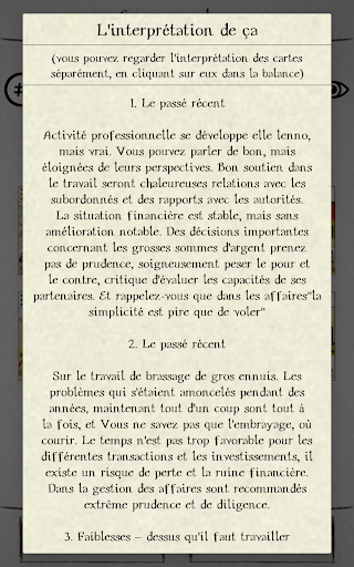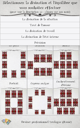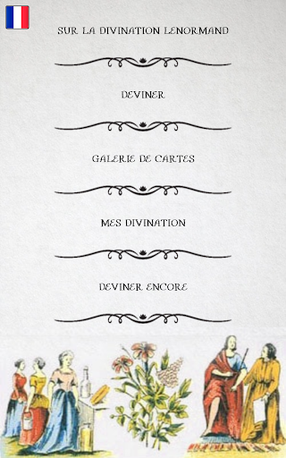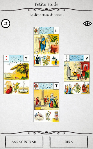 La mthode de divination dans notre application est absolument identique à la numérologie dans le réel de la cabine. Le processus de la divination et le résultat ne dépend que de Vous et de personne de plus. Un échantillon de cartes qui se passe selon les règles de la voyance Marie Lenormand. Grâce à cela, le résultat de la divination est très précis.
