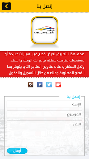 صمم هذا التطبيق لعرض قطع غيار سيارات جديدة أو مستعملة بطريقة سهلة توفر لك الوقت والجهد وتدل المشتري على عناوين المتاجر التي يتوفر بها القطع المطلوبة وذلك من خلال التسجيل والدخول على التطبيق حيث يمكن للتاجر من أي مكان في المملكة وخارجها عرض القطع المتوفرة لديه وتحديد عنوانه ويقوم المشتري باختيار المتجر المناسب له حسب مكان إقامته