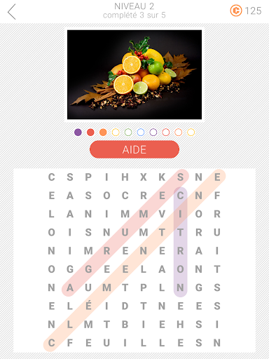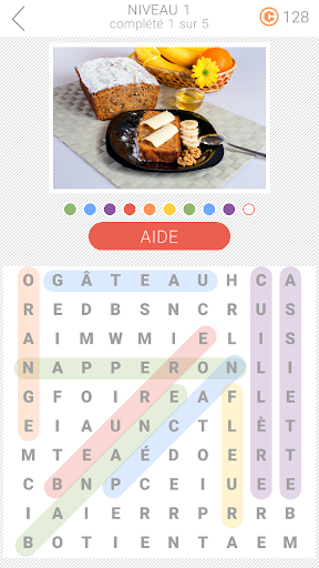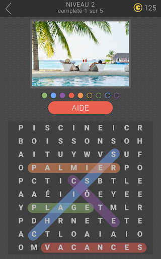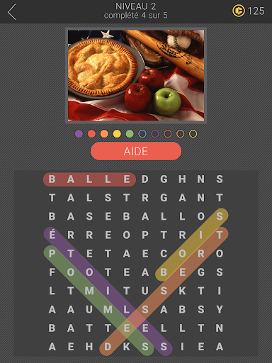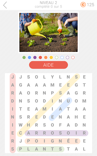 Regardez la photo, puis commencez à rechercher les mots. Vous pouvez appuyer sur l'image pour faire voir de plus près. Glissez votre doigt dans la grille des lettres pour sélectionner le mot. Utilisez le bouton d'aide si vous avez besoin d'aide.