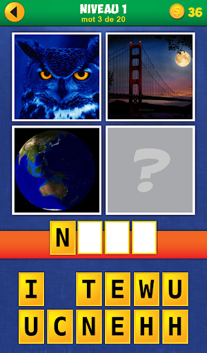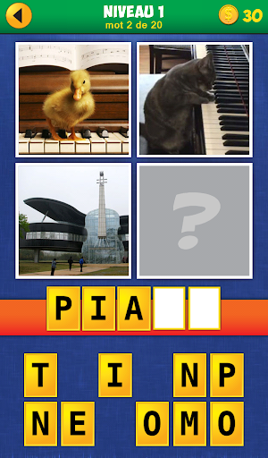 Regardez quatre images et devinez quel mot qu'ils représentent. Cela semble facile, mais certaines énigmes peuvent être difficile! Si vous aimez les devinettes et les jeux de mots, vous allez apprécier ce casse-tête fantastique.Ce jeu de mot vous est livré avec une différence du jeu original: les images vous sont révélés une par une.