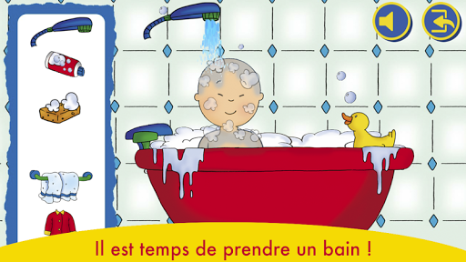 - Soir : De retour à la maison après une longue journée. Aidez Caillou à prendre un bain avant de ranger sa chambre, de préparer une pizza pour le dîner, de donner à manger aux poissons et d'aller au lit.