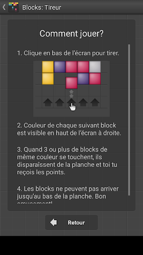 Tu tires en utilisant les blocks colorés. Quand les trois blocks (au minimum) de même couleur se touchent ils sont supprimés de la planche et toi tu reçois les points Vise les blocks de même couleur que ton missile.