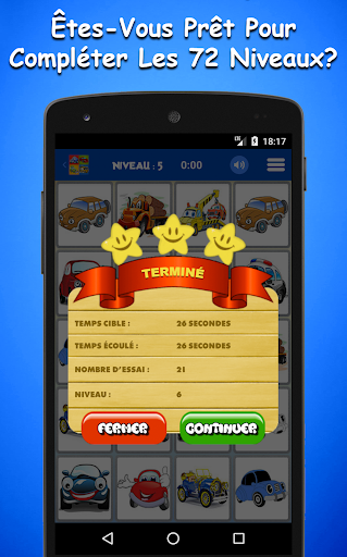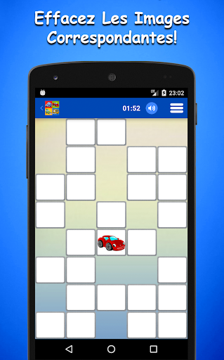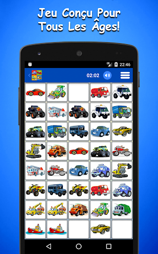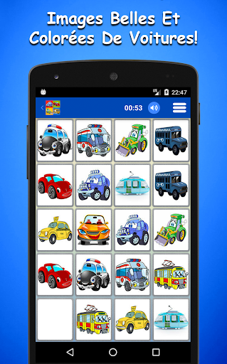 * Le Jeu De Mémoire De Voitures Pour Enfants a une interface simple et intuitive qui est facile à utiliser et à jouer. Ce jeu de mémoire gratuit est également optimisé pour les tablettes et il gardera vos enfants tranquilles et divertis en voiture, au restaurant et n’importe où.