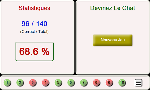Jeu "Guess the Breed of Cats" est un quiz amusant. Parmi les 3 variantes de la quête, vous devez choisir la race du chat, qui est indiqué sur les photos. Les bonnes réponses sont indiquées en vert, et les mauvaises-en rouge, pour chaque bonne réponse obtenir 1 point. Une fois que vous devinez 10 photos, vous serez en mesure de voir les statistiques-le nombre de réponses correctes et le nombre de toutes les photos, ainsi que le pourcentage de réponses correctes du nombre total de photos de chats.