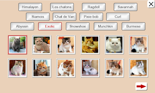 - 13 thèmes: «Himalayan », «Le Chatons », «Ragdoll», «Savannah», «Siamois», «Chat de Van», «Pixie-bob», «Curl», «Abyssin», «Exotic», «Snowshoe», «Munchkin», «Burmese».