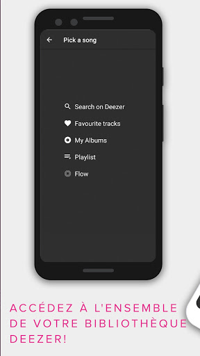 en tant que sonnerie de réveil. Programmez le moment de votre réveil avec ce réveil intelligent, cherchez rapidement de la musique dans l'immense catalogue de Deezer, et réglez la musique choisie en tant que sonnerie d'alarme sur votre téléphone ou votre tablette. Utilisez vos chansons préférées de