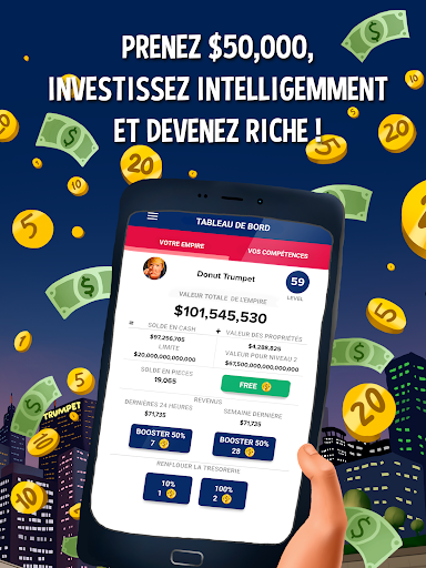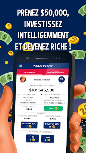 Donut Trumpet Tycoon vous donne le pouvoir d'acheter, de vendre et d’échanger numériquement des propriétés situées sur des emplacements réels dans le monde entier ! La clé du succès réside dans la stratégie dont vous userez dans le choix des propriétés, laquelle vous fera gagner le plus d’argent, laquelle aura le meilleur rendement ?