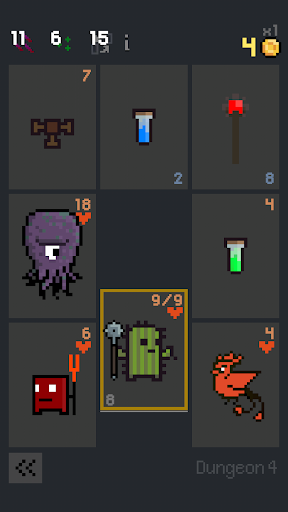 Dungeon Cards est un jeu de carte roguelike dans lequel vous déplacez votre héros sur un plateau de 9 cases. Vous devez affronter les cartes voisines afin de vous déplacer dans le niveau. Les cartes de monstres vous feront perdre de la vie, les cartes de soin vont... eh bien vous soigner, les cartes trésors vont augmenter votre score, et il existe tout un tas d'autres cartes aux effets et capacités uniques. Même si cela peut paraître compliqué, les règles sont très simples à comprendre dès les premières parties.