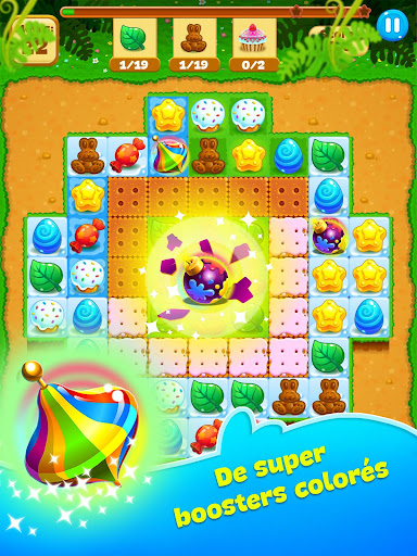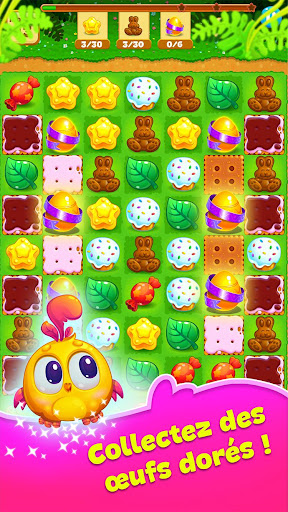 Intervertissez, tirez et balayez les morceaux de Pâques, comme les œufs de Pâques, les lapins en chocolat, les cupcakes crémeux, les bonbons en étoiles et les feuilles vertes du printemps. Faites des associations de 4 ou 5 pour créer des bombes et des power-ups puissants. Utilisez la baguette magique pour collecter une pièce unique. Vous serez récompensé avec des cookies, des gâteaux et beaucoup de chocolats!