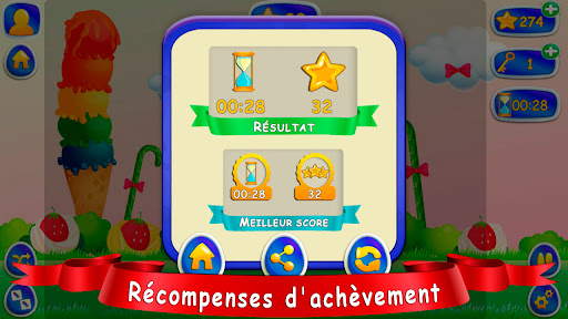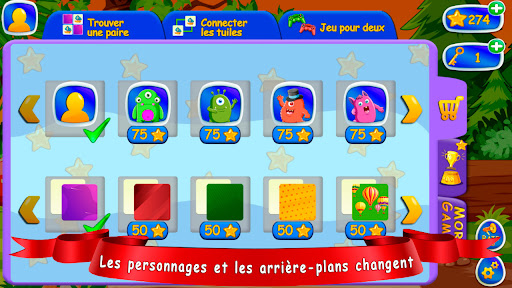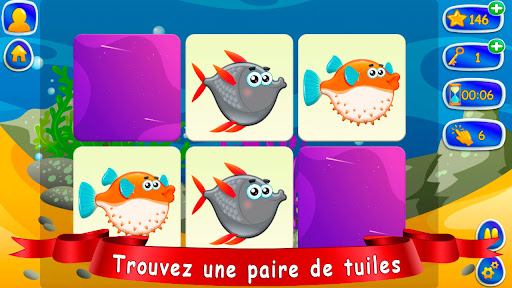 Le premier modes jeux enfan gratuit "Trouver une paire" - vous devez y trouver les mêmes images, en ouvrant deux cartes à la fois. Cela ressemble à un domino pour enfants lorsqu'un enfant joue avec des images lumineuses en les retournant. De plus, si la paire ne correspondait pas, les cartes sont fermées et le bébé doit se souvenir des images qui s'y trouvaient. Mais ce n'est pas difficile du tout, car il y a différents niveaux de difficulté dans le jeu. Il sera facile pour les kids de passer les cartes de niveau 2 par 2 ou 2 par 3, et pour les enfants plus âgés 3 par 4 ou 4 par 5 cartes, il y a des niveaux plus difficiles - 5 par 6 et 5 par 8. De plus, le jeux bebe a différentes sections tiles: fruits et baies, insectes, légumes et animaux, vie marine, sucreries et bien plus encore. Les joueurs peuvent choisir indépendamment les cartes pour les enfants qu'ils préfèrent. Les enfants aiment toujours établir de nouveaux records, pour cela nous avons fourni une minuterie. Et bien sûr il y a une récompense dans le jeu, les enfants auront certainement beaucoup de plaisir et d'émotions positives lorsqu'ils recevront des étoiles en récompense de leurs efforts.