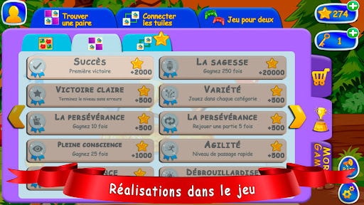 Le deuxième mode de offline games est "Connexion de tuiles" - dans ce mode, vous devez connecter des tuiles sur au moins trois rangées. Si cela prend plus de trois lignes, vous ne pourrez pas connecter les cartes. C'est assez simple, cliquez sur les mêmes cartes qui composent une paire et vous réussirez. Il existe également différents niveaux de difficulté dans le mode Tail Connect - c'est le nombre d'images mélangées par niveau. Plus il y a de cartes sur le terrain de jeu, plus il est difficile de connecter toutes les mêmes images (paires). Dans ce mode éducatifs, comme dans Find a Pair, il y a différentes sections, une minuterie, des astuces et des récompenses.